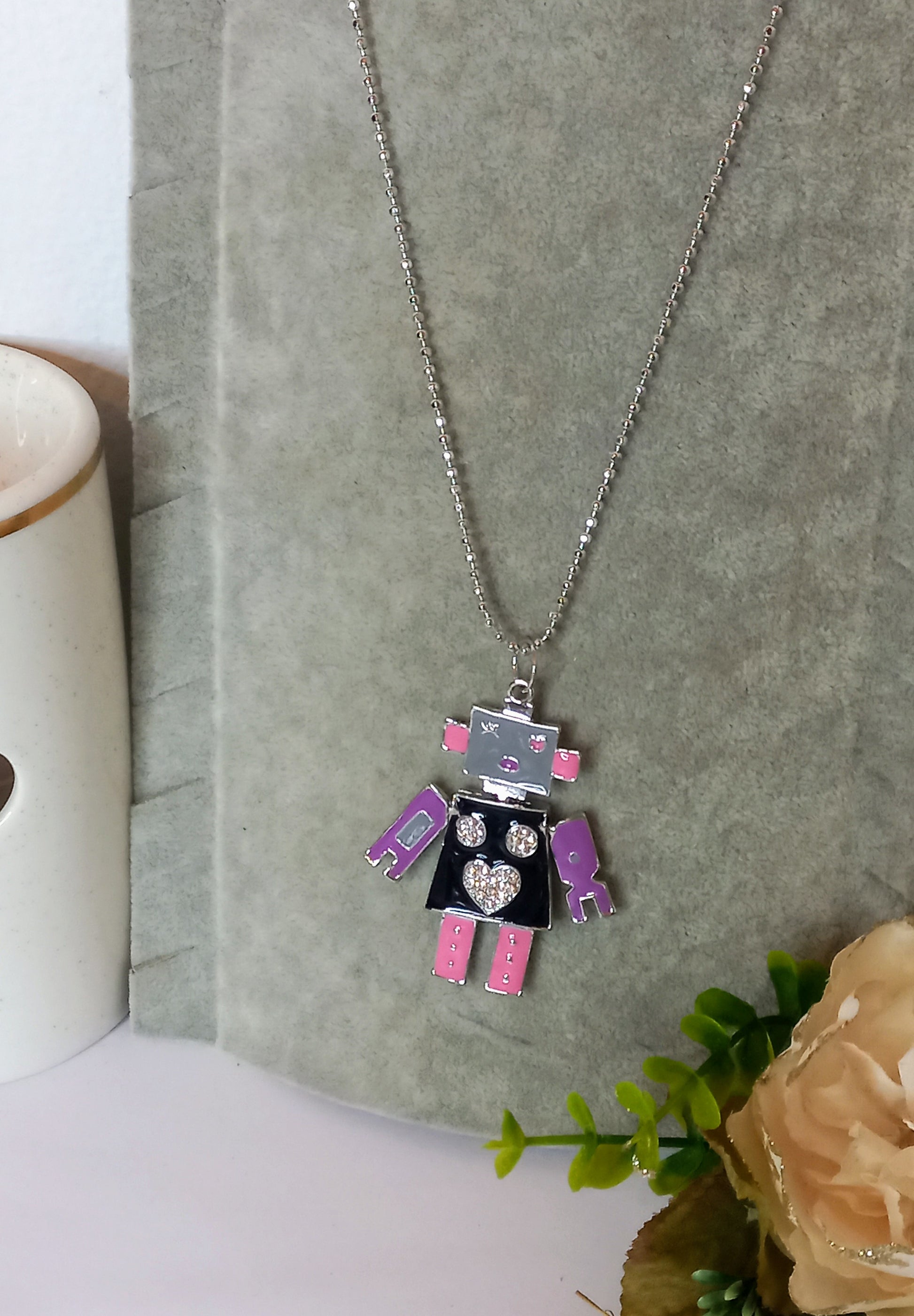 Long Sautoir réglable en forme de robot , de couleur violet, noir, rose, argent et strass.