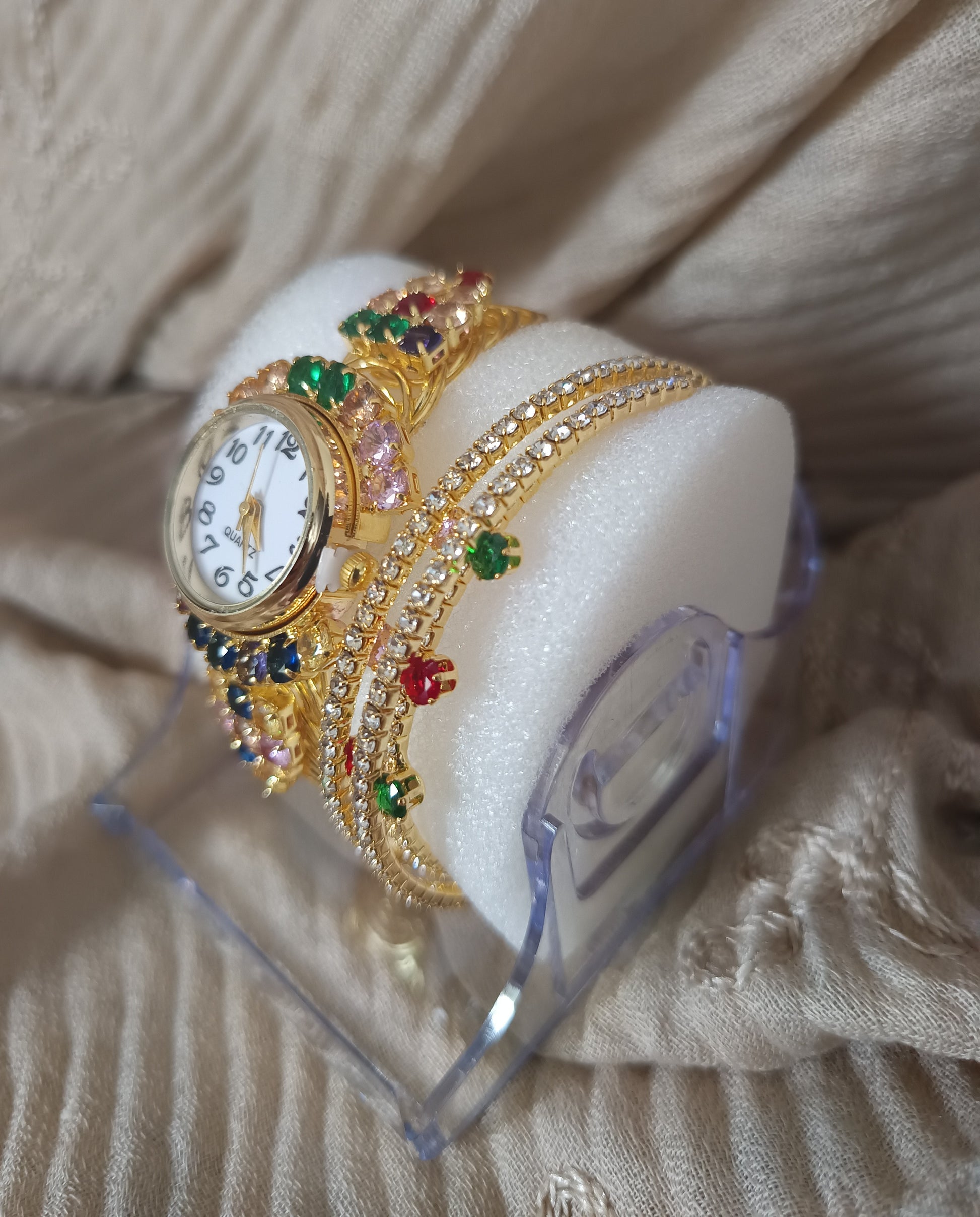 Cette montre et bracelet en or offre un style fantaisie unique qui ajoutera une touche d'éclat à votre tenue.